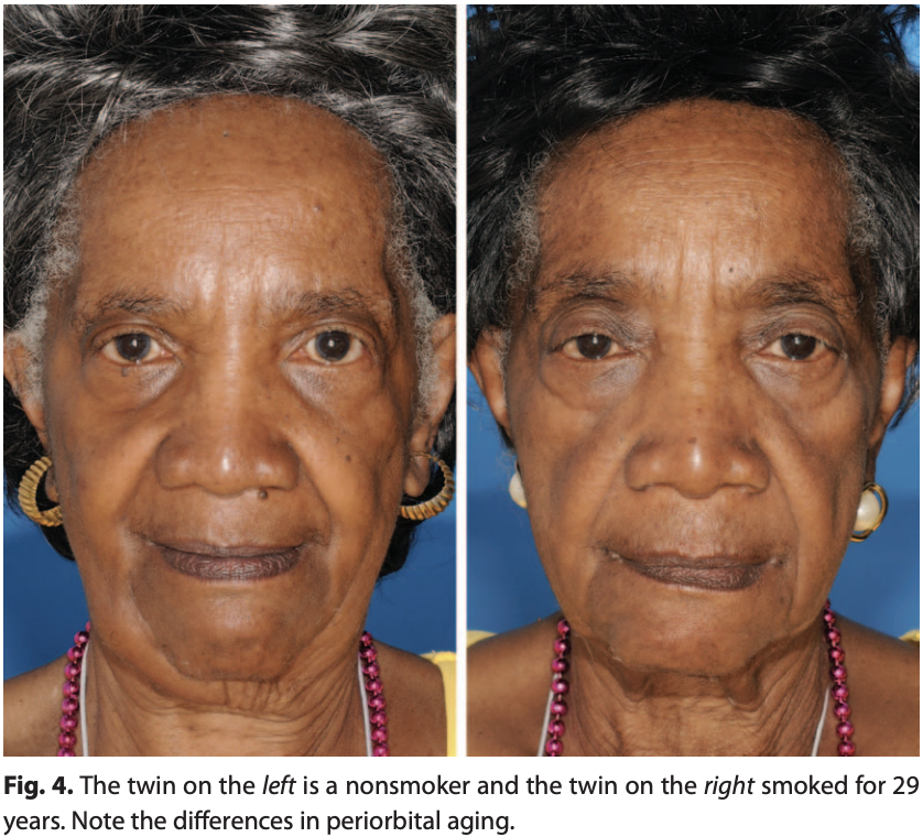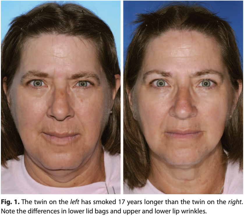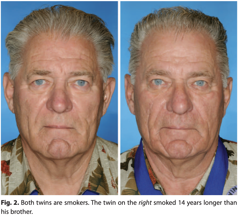 [7]Okada, Haruko C et al. “Facial changes caused by smoking: a comparison between smoking and nonsmoking identical twins.” Plastic and reconstructive surgery vol. 132,5 (2013): 1085-1092. doi:10.1097/PRS.0b013e3182a4c20a