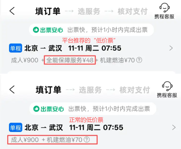 比如,订一张北京飞往武汉的机票,打开携程,选好时间和航班,来到付款界面,你会发现: