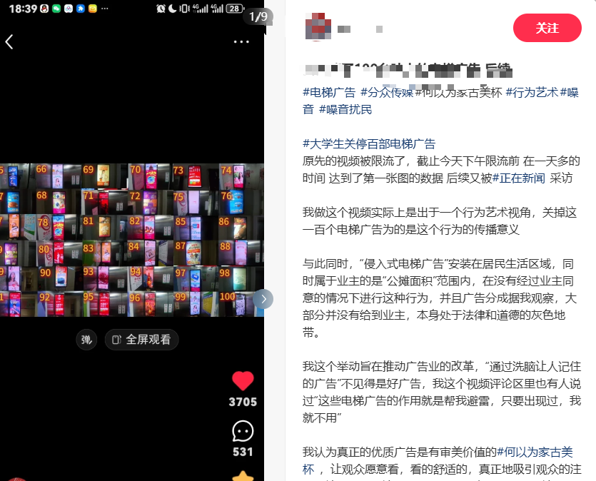 孔同学的视频,在某社交平台上,如今已有接近上万点赞和几百条转发量。视频中,他展示了自己出入不同的小区,并用工具一口气关掉小区里面电梯广告的场景,最终统计为100台电梯广告。