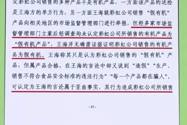 判决书指出,一方面该产品的送检是王海方的单方行为;另一方面,王海就彩虹公司销售“假有机”产品向相关地区的市场监督管理部门进行举报,经20多家市场监督管理部门立案调查,均未认定彩虹公司所销售的有机产品为“假有机产品”,王海并无确凿证据证明彩虹公司销售的有机产品为“假有机”。