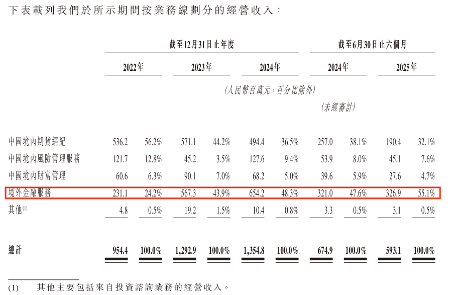 根据弗若斯特沙利文报告,公司2023年和2024年的境外收入均在中国期货公司中排名第一。2024年,南华期货境外业务营收6.54亿元,较2023年增长15.32%;2025年上半年,继续同比增长1.8%至3.27亿元,已占公司总营收比重的55.1%,实质性撑起南华期货业绩的半壁江山。