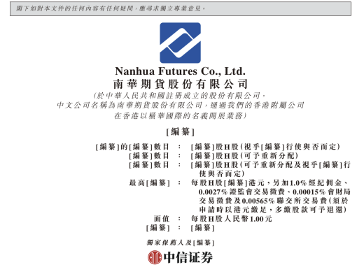 公开资料显示,南华期货拟发行不超过1.24亿股境外上市普通股,并在香港联交所主板上市,独家保荐人为中信证券。