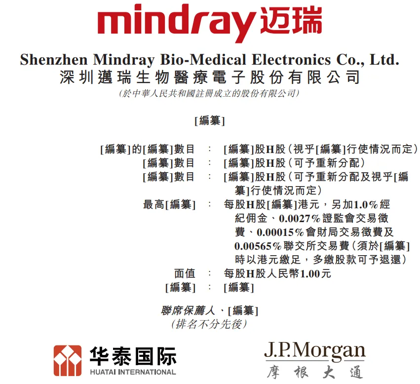 据港交所11月10日披露,深圳迈瑞生物医疗电子股份有限公司向港交所主板提交上市申请,华泰国际、摩根大通为联席保荐人。截至11月10日收盘,迈瑞医疗(300760.SZ)报209.35元/股,市值2538.25亿元。