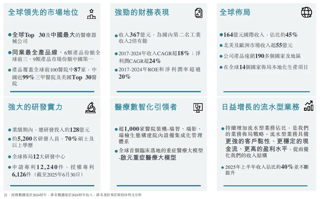 据招股书,迈瑞医疗是全球领先、创新驱动的世界级医疗器械企业及医疗数智化引领者。根据弗若斯特沙利文的资料,在中国医疗器械行业,公司2024年的市值规模超过境内主要龙头企业(第二到五名)之和,工业收入是第二名的两倍有余。