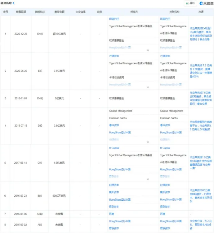 一来,作业帮曾是资本竞相追逐的宠儿,如今五年未获得过融资**。**早在,从2015年到2020年,它便完成了从A轮到 E + 轮的8轮融资,融资规模一轮高过一轮,2020年12月的E +轮融资更是超16亿美元,公司估值也一度突破 110 亿美元,成为行业内不可忽视的力量。