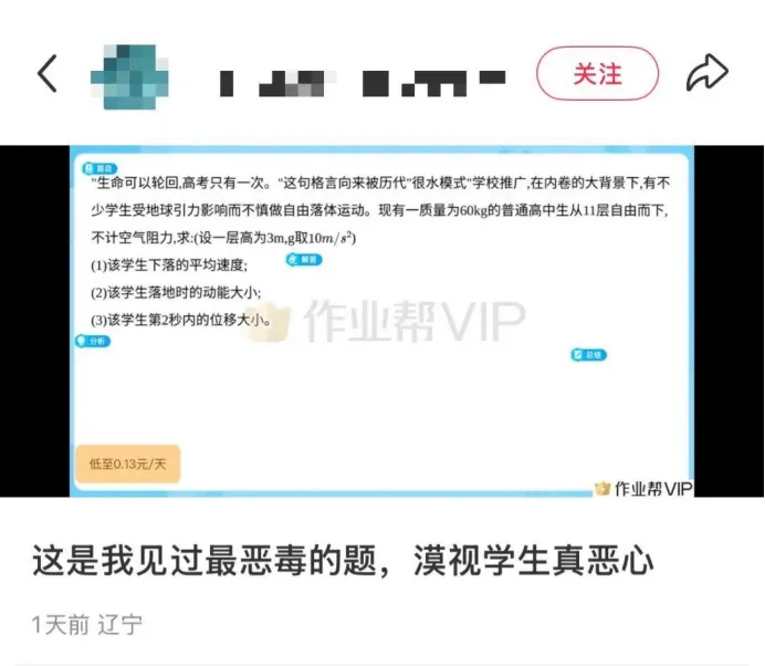 有网友在社交平台爆料,作业帮App上惊现一道令人毛骨悚然的题目:“生命可以轮回,高考只有一次。在内卷的大背景下,有不少学生受地球引力影响而不慎做自由落体运动。现有一质量为60kg的普通高中生从11层自由而下,不计空气阻力,求该学生下落的平均速度。”
