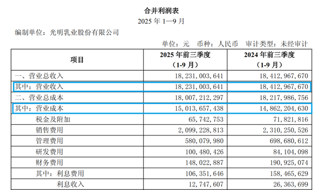 然而,自2004年被蒙牛反超之后,光明就彻底从“神坛”跌落,与蒙牛的差距越拉越大,营收更是只有千亿巨头伊利的零头,在2022-2024连跌3个财年之后,最新公布2025年三季度财报,仍充斥着几分寒意: