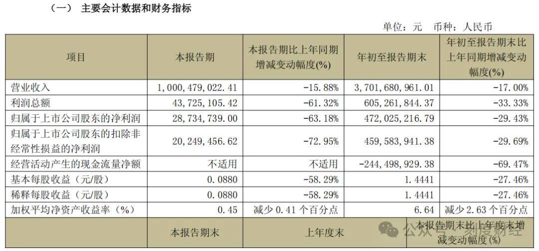 另外,利润端的崩塌比营收更为惨烈,数据显示,前三季度归母净利润4.72亿元同比下滑29%,单三季度净利润仅0.29亿元,同比大幅下滑63%,创近年单季盈利新低。