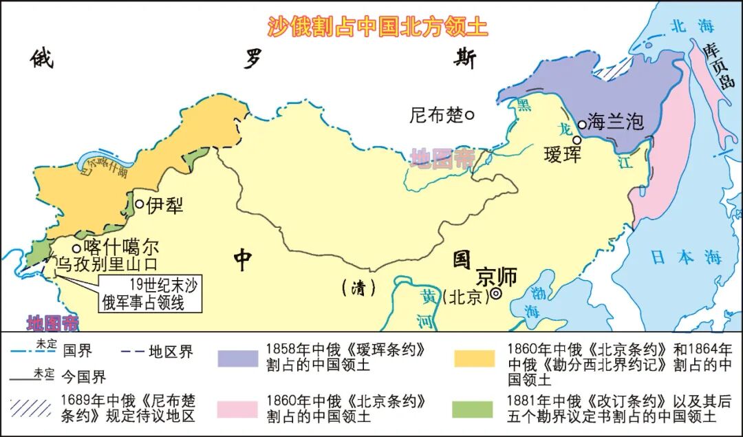 俄罗斯帝国与清朝先后签订中俄《瑷珲条约》《北京条约》《勘分西北界约记》《改订条约》等不平等条约,从清朝东北和西北割占大片领土。