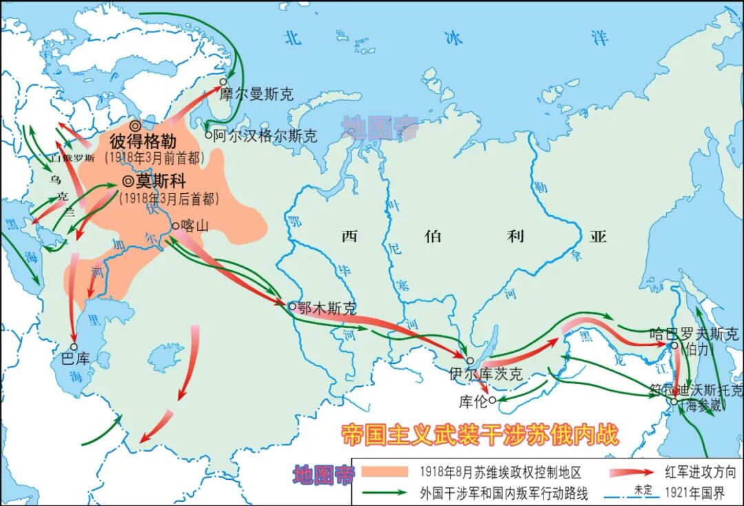 一战后,英国、法国、日本、波兰、美国等不满苏俄单方面退出对德战争,以及沙俄债务等问题,对苏俄进行了武装干涉。