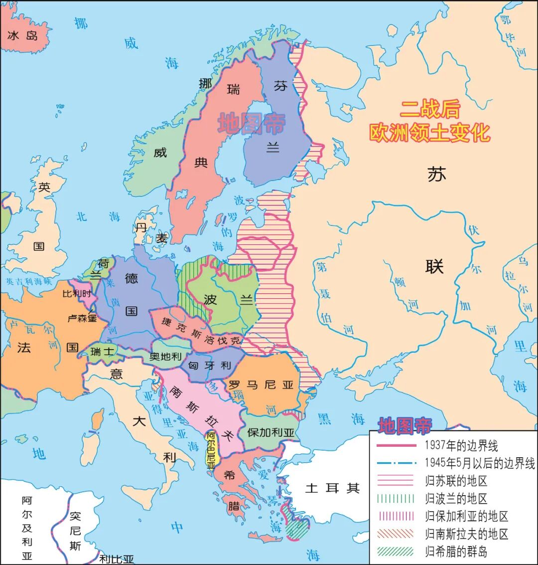 二战后,苏联从德国获得东普鲁士北部(俄罗斯加里宁格勒),西部领土向波兰方向推进了两百多千米(主要分布在今白俄罗斯和乌克兰)。