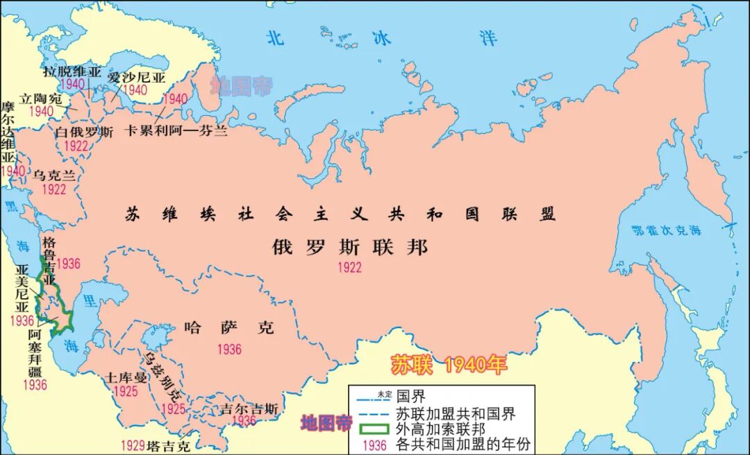 1922年,俄罗斯联邦、外高加索联邦、乌克兰、白俄罗斯成立苏联,后来陆续扩至15个加盟共和国,包括波罗的海三国,时间跨度是1922年-1991年。