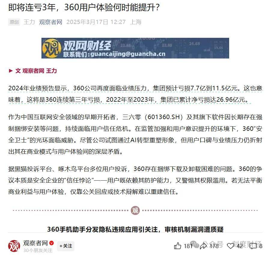 整体来看,三六零堪称是一部中国互联网产业变迁的缩影:从PC时代的颠覆者,到移动互联网的失语者,再到AI时代的艰难追赶者。它曾以“免费”打破旧秩序,却也因战略摇摆、资源分散而错失新浪潮。今天的三六零,仍在“安全+AI”的赛道上负重前行,账面亏损、用户流失、竞品环伺,每一步都如履薄冰。