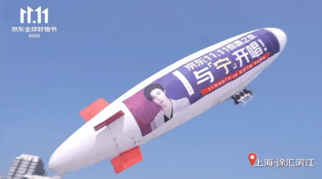 11月初,双11的氛围升温,黄浦江上就“飘”来了巨型刘宇宁飞艇,飞艇上印着“京东11.11惊喜之夜·与「宁」开唱”,就像是给全城发了一张空中请柬,连飞三天,排面拉满;随后亚洲最大LED大屏“68w”的西湖天幕、上海美罗城等上海、杭州双城的标志性大屏不断联动出现刘宇宁京东11.11吸睛物料……还有印有刘宇宁形象的“惊喜痛车”,沿着上海20路公交路线,途经外滩、南京路、人民广场、上海电视台、静安寺等地标一路巡游。