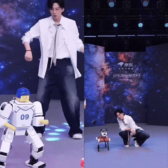 二是与往日截然不同的直播。“初代抖帝”刘宇宁往日的直播大多数“唠嗑”风格,而这一次,画风突然起了科技范儿。在10月16日的京东直播间里,刘宇宁竟然和机器人一起跳舞(众所周知,刘宇宁的四肢协调能力……),还逗上了机器狗(呆米别哭……)。