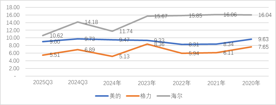 2025年前三季度,家电三巨头ROE均保持在15%以上,其中格力同比下降近三个百分点,这是在销售费用率下降的基础上实现的;美的与海尔同比略有优化。