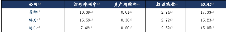 而销售净利率与资产周转率则呈现差异:格力销售净利率占优,但资产周转率仅为36%,分别为海尔的45%和美的的59%。