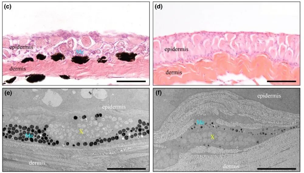 地表鱼类细尾高原鳅(左)和洞穴鱼类玫瑰高原鳅(右)皮肤的染色切片(c、d)和黑素细胞电镜照片(e、f)(图片来源:参考文献[2])