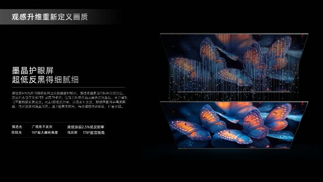 此外,硬件层面的协同,更让观感升维落地为可感知的体验。3000nits峰值亮度与墨晶护眼屏的AGLR超低反射率技术搭配,即便白天开窗让阳光直射屏幕,画面依然清晰通透,避免了白天看屏像看镜子的尴尬;DCI-P3高色域覆盖与3D-LUT4913色彩精准校正技术结合,可精准显示亿种色彩,无论是电影里夕阳下的暖橙渐变,还是动画中角色的细腻肤色,都能避免色彩偏差,还原内容本真;超高刷新率则完美适配赛车、动作电影等高速动态场景,全程无卡顿、无拖影,让观感不再是纸面上的参数,而是每一次观影时的沉浸享受。