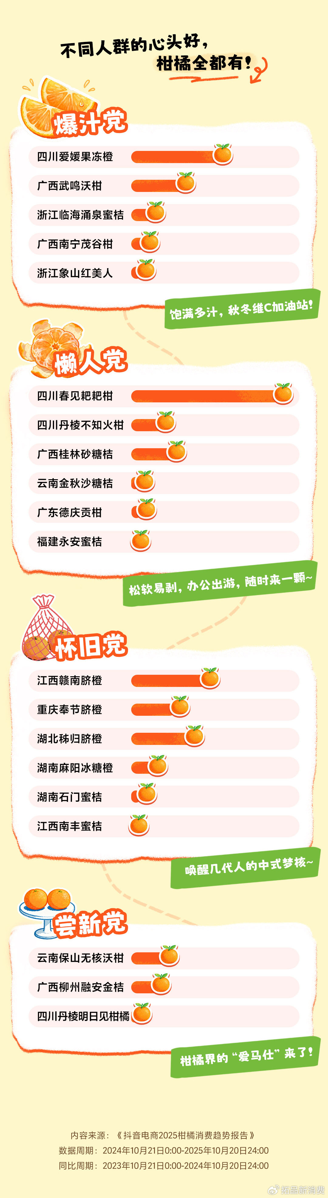 与此同时,抖音电商丰富的柑橘供给满足了不同人群、特定场景的消费需求。例如:爆汁党偏爱四川爱媛果冻橙、广西武鸣沃柑等饱满多汁的品类,成为秋冬维C补给的首选;懒人党钟情四川春见耙耙柑、广西桂林砂糖橘等松软易剥的品种,适配办公出游等随时食用的场景;怀旧党对江西赣南脐橙、湖北秨归脐橙等经典柑橘情有独钟;尝新党则热衷于云南保山无核沃柑、广西柳州融安金桔等柑橘界的“新贵”。