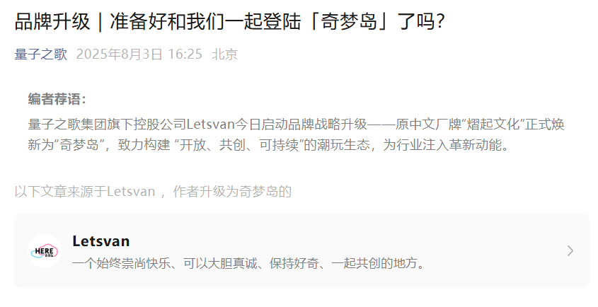 自2024年12月至2025年3月31日,量子之歌已通过多轮交易实现对深圳熠起文化有限公司(以下简称“Letsvan”)的控股并表。Letsvan作为中国潮玩产业先锋,专注于全球艺术家IP孵化、运营及潮玩产品全链路商业化。