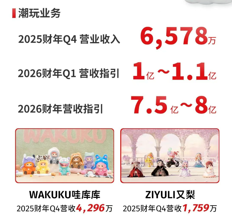 而量子之歌的潮玩业务也展现出了成长性。2025财年(截至2025年6月30日)第四季度及全年财报显示,2025财年公司全年实现营业收入27.26亿元,净利润3.57亿元;第四季度实现营业收入6.18亿元,净利润1.08亿元。值得关注的是,本季度首次纳入披露的潮玩业务实现营业收入6578万元,占总营收约10.6%。奇梦岛计划,潮玩业务2026财年创收7.5亿-8亿元。