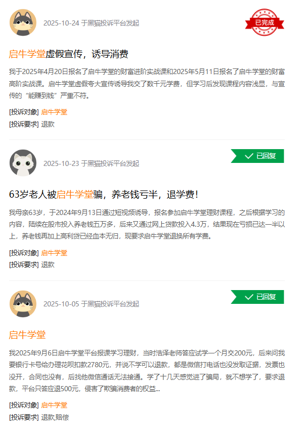 “趣解商业”注意到,截至11月11日,在黑猫投诉平台上,共有4353条投诉中包含搜索词“启牛学堂”。投诉内容包括不予退款、诱导消费、课程宣传与实际不符等方面。
