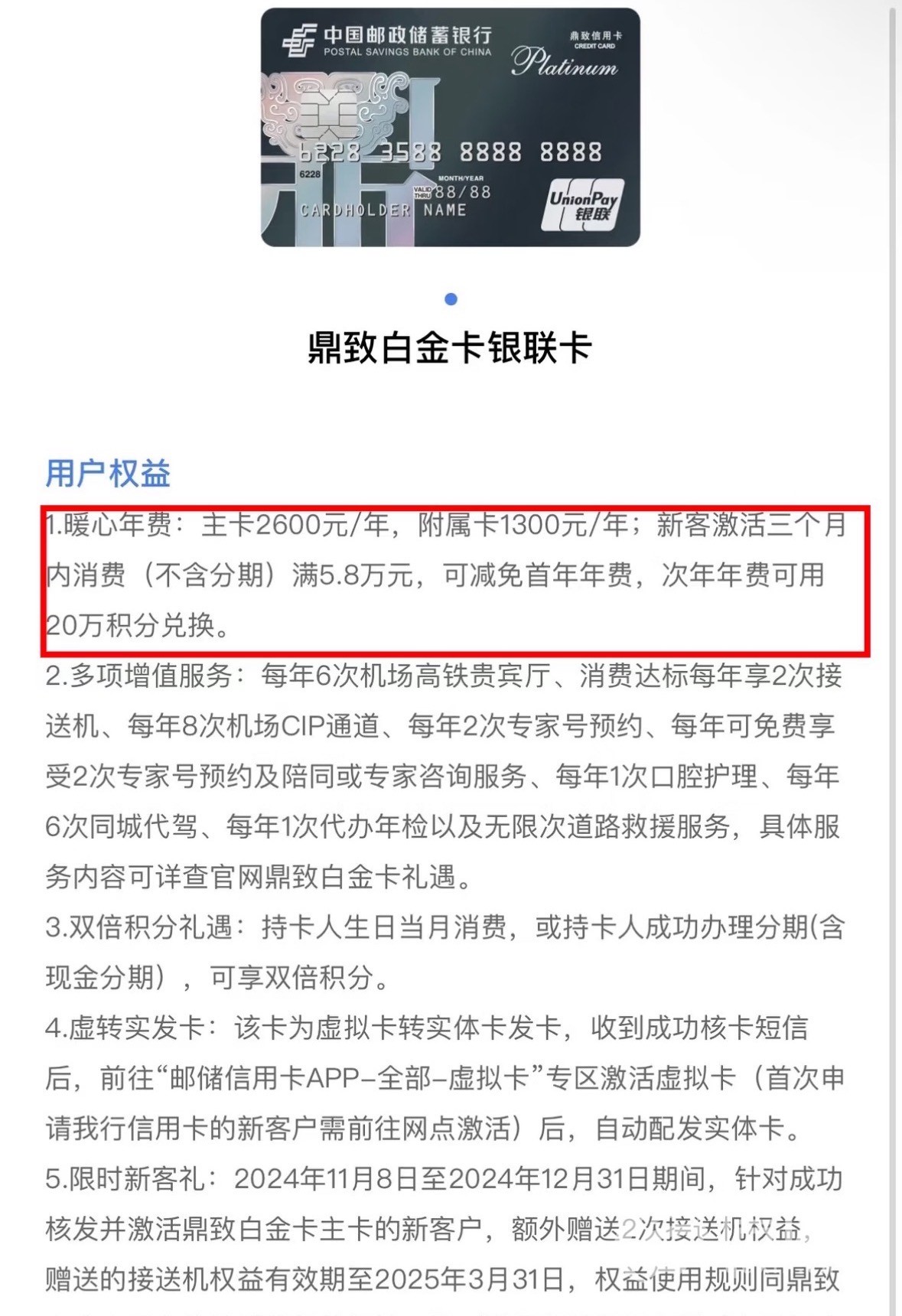 邮储银行鼎致白金卡用户权益的说明。(来源:受访者)信网/信号新闻11月8日讯 近日,天津市民王女士查询账单时发现,自己新办的中国邮政储蓄银行(以下简称邮储银行)鼎致白金卡产生了2600元年费,让她非常恼火。王女士认为,当初工作人员推销办卡时只说“消费免年费”,自己在不了解具体年费政策的情况下办了白金卡,邮储银行显然在误导用户。对此,邮储银行信用卡部工作人员回应称,若存在告知不到位的情况,将进行整改。据了解,目前邮储银行已向王女士道歉并退还了年费,王女士也已注销了该信用卡。
