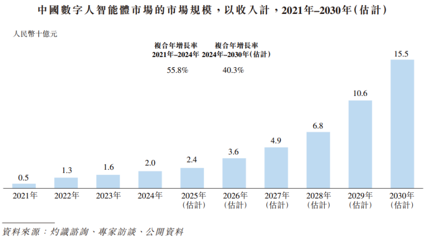 从收入来看,中国数字人智能体市场规模从2021年的5亿元增加至2024年的20亿元,复合年增长率为55.8%;预计到2030年将达到155亿元,2024年至2030年的复合年增长率为40.3%。