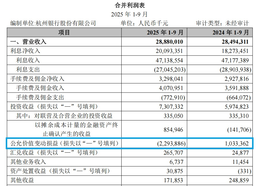 真正拖累杭州银行营收增长的重要因素之一,是公允价值变动损益——2025年前三季度为-22.94亿元,而2024年同期为10.33亿元。