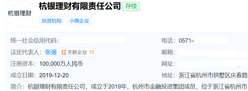 天眼查显示,杭银理财成立于2019年12月20日,注册资本为10亿元,法定代表人是张强。