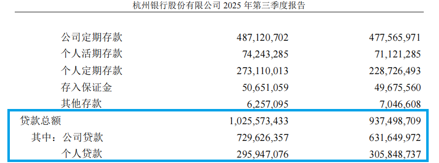从贷款类型上看,2025年三季度末,杭州银行的个人贷款持续压降,2959.47亿元的规模较2024年末减少99亿元,下降3.2%。但是公司贷款达7296.26亿元,较2024年末增加979亿元左右,增长15.5%。