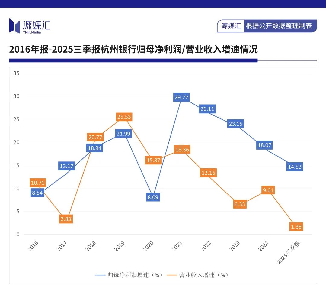 进入2025年,杭州银行的营收增速继续放缓,更是在第三季度遭遇“急刹车”。