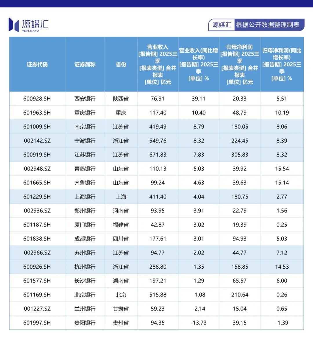 2025年三季报披露后,杭州银行一组具有强烈反差的数据引发市场关注:前三季度营业收入同比仅增长1.35%,增速在长三角A股6家上市城商行中排名垫底;归母净利润却同比增长14.53%,增速在6家城商行中拔得头筹。而利润增长的一个“小秘密”是:信用减值损失同比下降了38.47%。