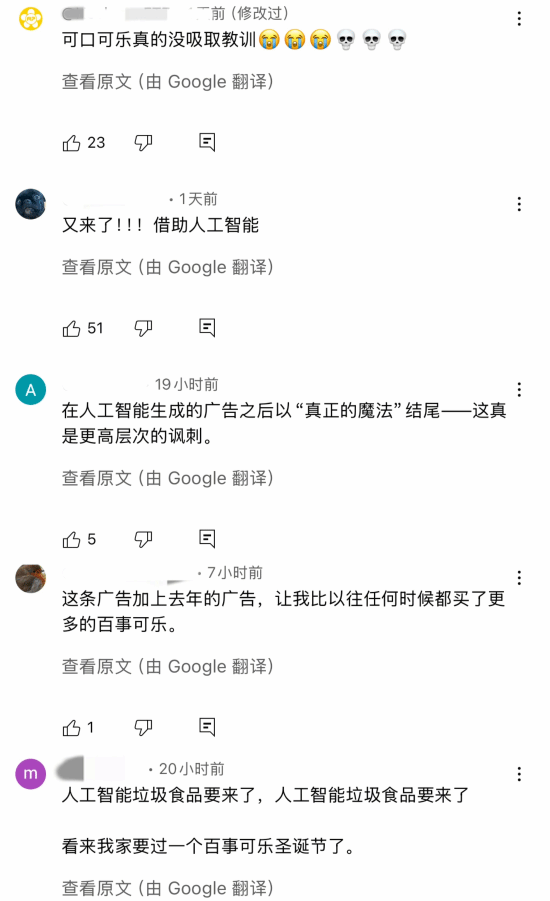 以可口可乐的圣诞广告为例,那辆象征节日温情的红色卡车,如今变成了观众的笑点。有人在X上调侃:“连车轮都懒得转了,这就是AI带来的生产力革命吗?”还有网友补刀:“圣诞老人被裁员了,接下来该轮到驯鹿。”