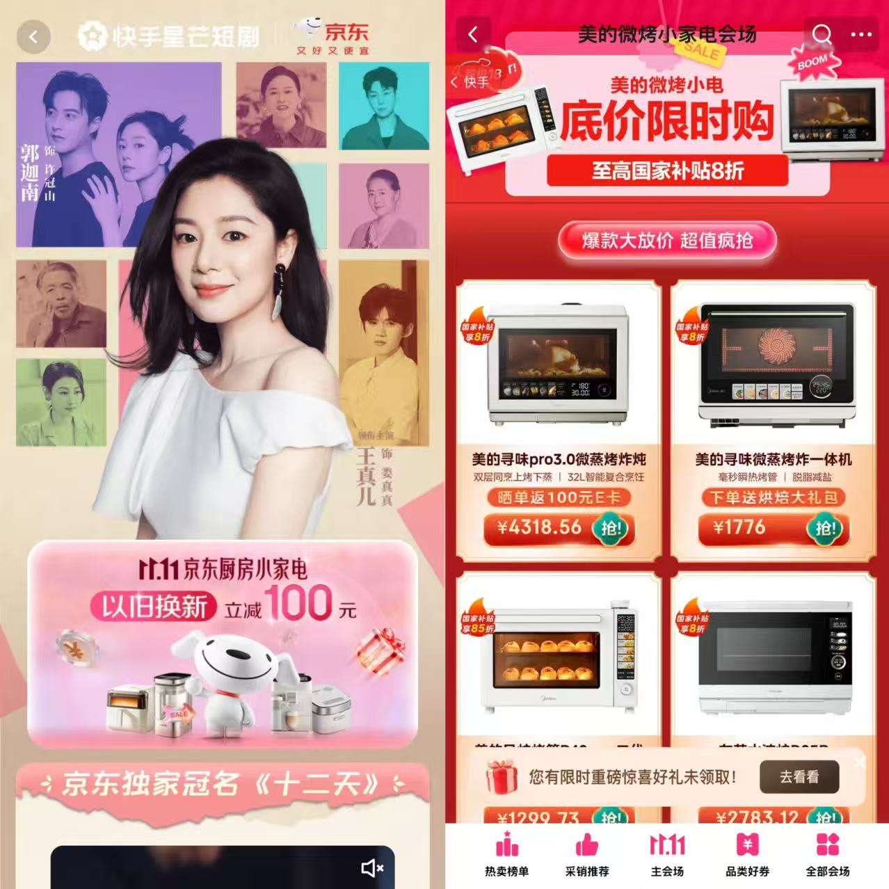 双十一期间,京东与快手星芒短剧,推出了包括《都要好好的》《说谎的月亮》《浮生拍卖行》《诱香》《浪漫和弦》《十二天》《偏宠小疯妻》《静安的CBD》在内多部短剧,这些海报在短剧页面banner位滚动播放。顺畅的剧集植入配上顺滑的页面跳转,让快手与京东一起建立起“内容即货架”的路径,成功组建情绪共鸣到消费行动关键闭环。
