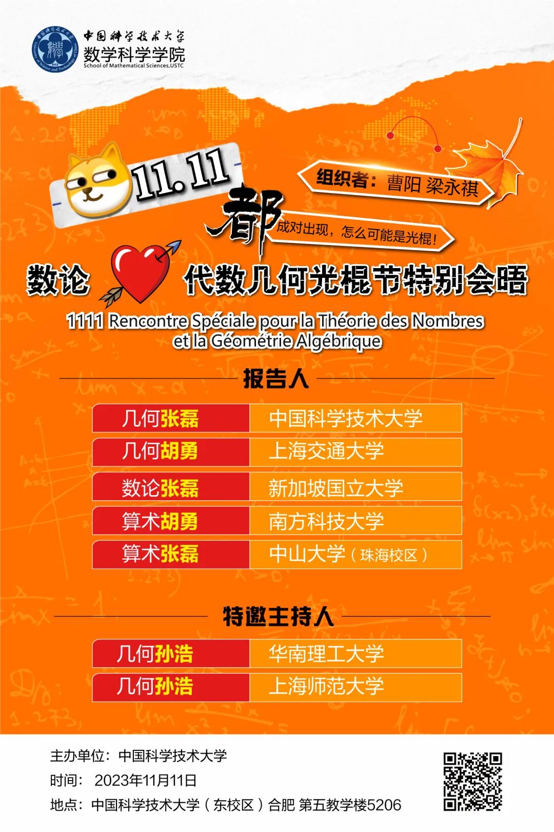 联系上之后,我发现梁永祺教授组织了一个超级搞笑的活动,叫做“数论与代数几何光棍节特别会晤”(https://faculty.ustc.edu.cn/yqliang/files/1111conf.htm),邀请了好几位青年数学家来参加,包括三位张磊、两位胡勇和两位孙浩,还有陈景润来致开幕辞。