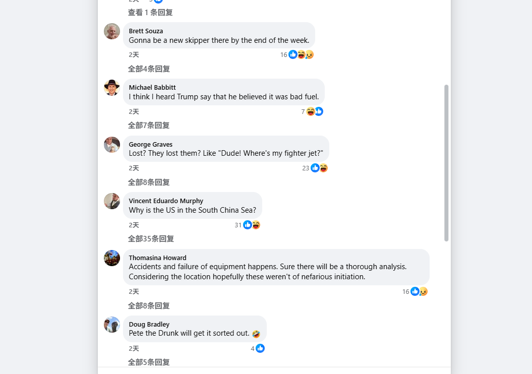 评论区有位母亲留言:“我儿子现在就在‘尼米兹’号上服役。看到这些坠机新闻,我真的很担心。但更让我生气的是那些嘲讽的人——他们不知道军人承担的风险有多大。我们的孩子在保卫这个国家(乌鸦评:令郎跑南海“保卫美国”是怎么个事?),我们在做什么?给他们最廉价的支持?”