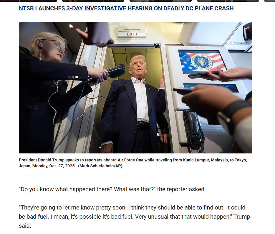 针对坠机事故,美国总统特朗普在空军一号上的回应将闹剧推向高潮——面对记者追问,他语出惊人:这可能和燃料不好有关。