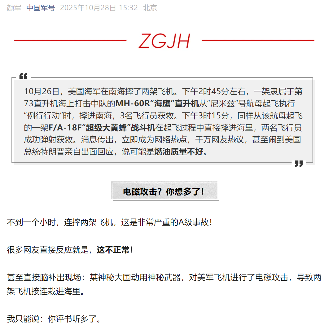 “我刚看新闻,美国海军在30分钟内损失了两架飞机。这效率,我家修屋顶的小工都比不上!至少他们还知道换一桶新汽油再来!”