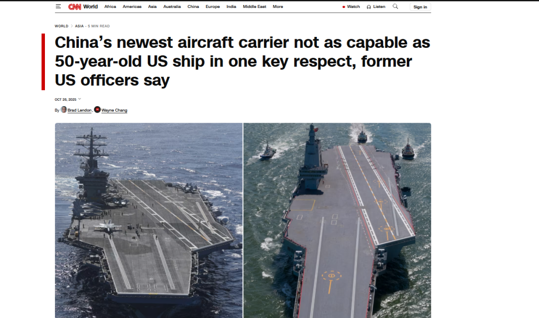 文的,10月25日,两名前美国海军军官在媒体上发表"权威分析",锐评福建舰的"致命缺陷",说中国人的电磁弹射系统不成熟、舰载机配置落后、整体作战能力还"不如服役半世纪的尼米兹级",作战能力只能达到尼米兹的"60%"。