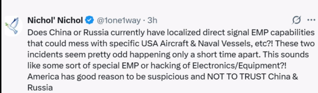 这个说法很快得到了这位Nichol的认可,他也询问美国军方:中俄两国是否已经具备了局部直接信号电磁脉冲干扰能力,可以干扰特定的美国军舰和飞机?要知道,两起坠机事件相隔太短了,实在不合常理,这绝对是某种特殊电磁脉冲或者黑客搞鬼。