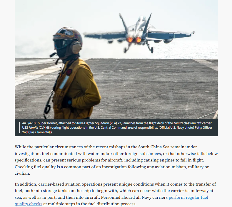 各位,我大美海军真是流年不利呀,又出了这档破事,幸好人没事,有人说是老中在搞鬼,但要我说,真要是老中,你以为就这两架飞机吗?整艘航母都直接报销了,所以说,这就是大统领说得那样,是那’脏油’惹的祸!" 原来啊,航母油箱里可能有一部分燃油被"污染"了!直升机加了点"脏油",歇菜了;战斗机也没躲过,加了同一批油,也跟着躺下了!
