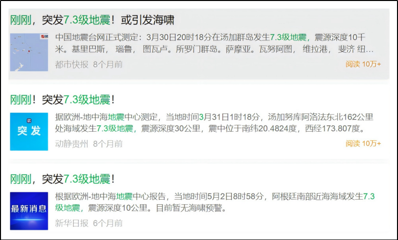 同样,《刚刚,突发7.3级地震》这类标题,制造完紧张气氛后,让人以为是我们国家的事,打开一看是汤加群岛的。