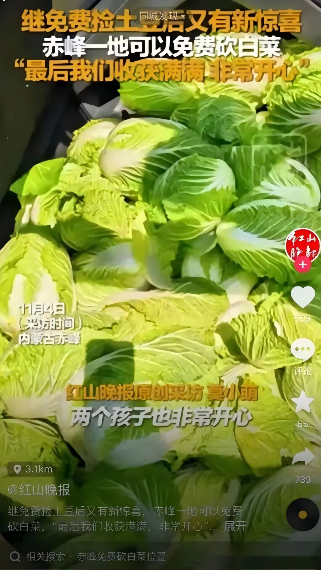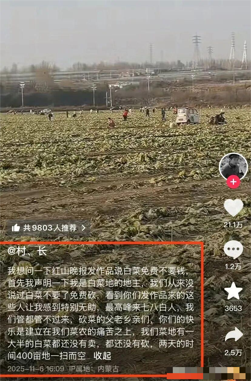 这时红山晚报在未核实情况下,也发布了赤峰某地白菜可以免费砍的视频。