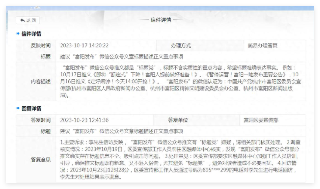 2023年10月,浙江一位市民李先生通过反映说,当地的微信公众号推文标题多为“标题党”,如《即将“断崖式”下降!富阳人提前做好准备!》《暂停运营!富阳一地发布重要公告》《定好闹钟!今天14:00开抢!》。
