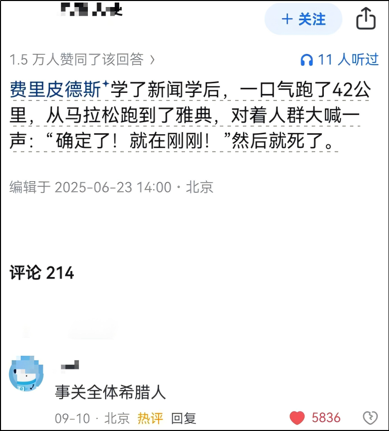 费里皮德斯学了新闻学后,一口气跑了42公里,从马拉松跑到了雅典,对着人群大喊一声:“确定了!就在刚刚!”然后就死了。