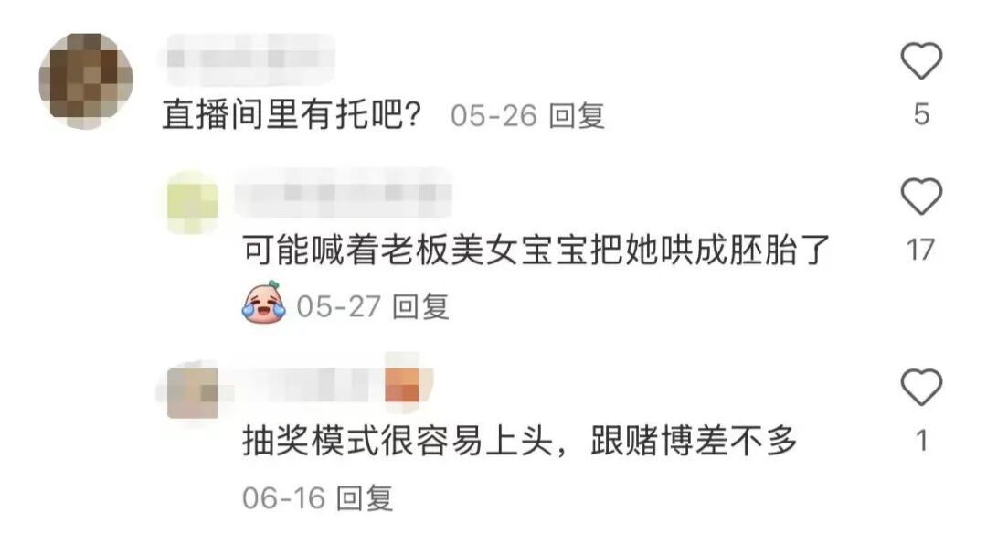 在很多直播间,欧皇也是被安排好的。一位网友发帖吐槽,说试玩时欧气爆棚,真金白银下单后却非到泪流,质疑主播在镜头外操控颜色。在小红书对对碰的帖子评论区里,“剧本”、“清台都是假单”、“冤种而不自知”等讨论层出不穷。