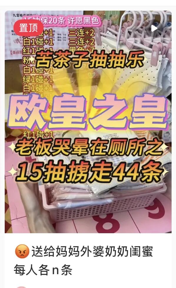 于是各个直播间里出现了苦茶子抽抽乐、袜子抽抽乐、零食抽抽乐、文具抽抽乐、纸巾抽抽乐,大多是单价不高的日用品,这些商品反正大家平时也要买,晚买不如早买,拼多多买不如直播间买——万一欧中了呢?