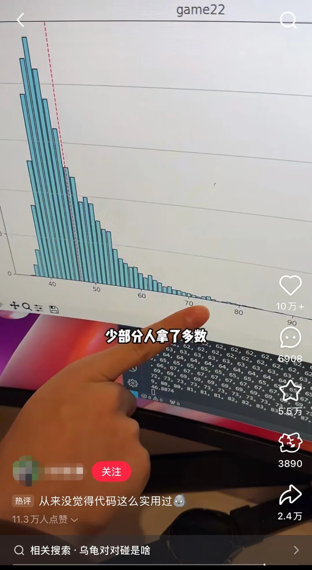 概率当然是不高的啦。一位网友按直播间的游戏规则写了一个程序:一共10个颜色,清台+5、三连+5、幸运色+1、全家福+5,运行10000次。